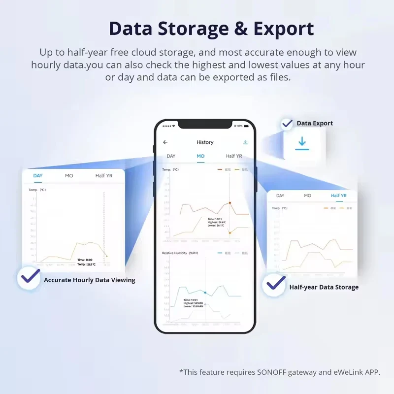 The SNZB-02D sensor supports APP monitoring, you can not only check the current temperature & humidity on the LCD display, but also track the real-time and historic temperature or humidity data via the app on your phone, with up to 120m/400ft coverage (no obstructions and ideal conditions), you can check the latest data at any time, and once the temperature or humidity exceeds the preset range, you will receive an instant alert from the APP, you can view the temperature and humidity date by day, month, and year, the half-year curve graphs provide a clear data-changing track. you can export data as .CSV files, the temperature and humidity of the sensor can be set as triggers, such as setting the humidifier to turn on when the humidity is less than 40%, adjusting to the comfort temperature and humidity at any time for your health, it works with Alexa and Google Home, just ask Alexa or Google Home and you'll know the temperature or humidity.